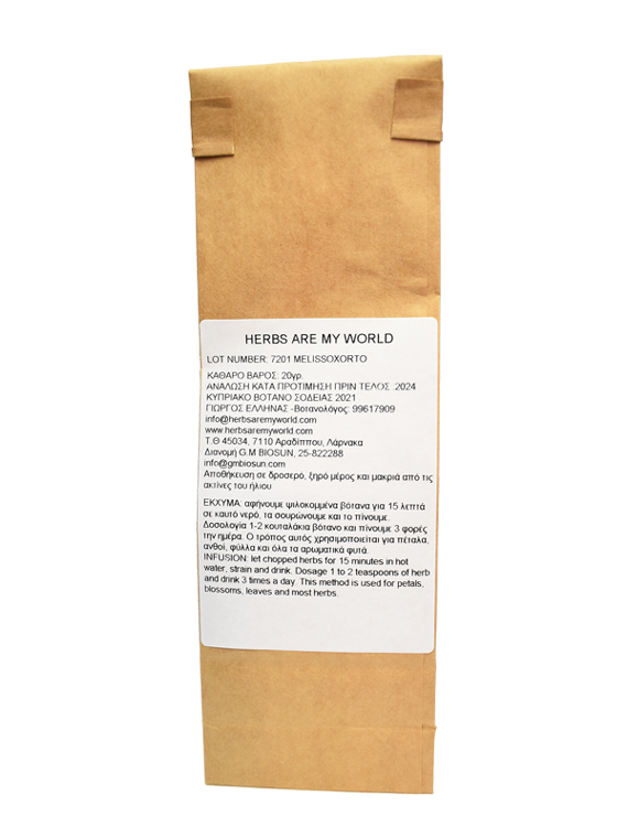 Η µέλισσα η φαρμακευτική, γνωστή σαν µελισσόχορτο, µελισσοβότανο και µελισσάκι. ανήκει στην οικογένεια των Χειλανθών. Είναι πολυετές φυτό µε ρίζωµα που έρπει και οι βλαστοί του είναι τετράγωνοι και διακλαδίζονται κατά την ανθοφορία. Έχει φύλλα ωοειδή, οδοντωτά με μικρό μίσχο και έντονες νευρώσεις και µε ένα λεπτό άρωμα λεμονιού. Τα άνθη του άσπρα ή ρόδινα βρίσκονται κατά ομάδες των 4-12 στη βάση των άνω φύλλων. Ανθίζει από το Μάη µέχρι το Σεπτέµβρη και το συναντούμε σε υγρά μέρη σε όλο το νησί.