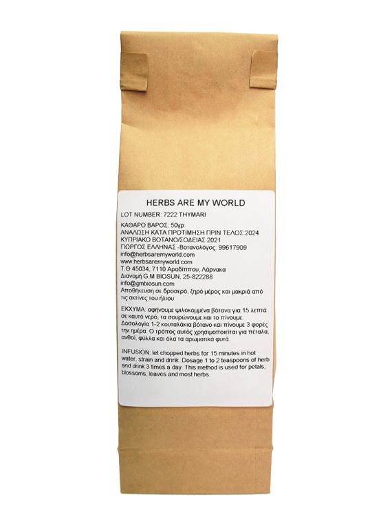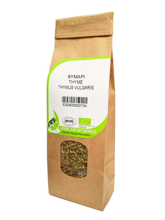 Ο θύμος, ο κοινός το κοινό θυμάρι, είναι μικρός φουντωτός, πολύκλαδος θάμνος, µε ωοειδή προμήκη φυλλάρια, που ανθίζει µε τα χαρακτηριστικά ρόδινα άνθη του. Συνήθως το βρίσκουμε να καλλιεργείται στον τόπο µας. Είναι και τα δύο αρωματικά φυτά.